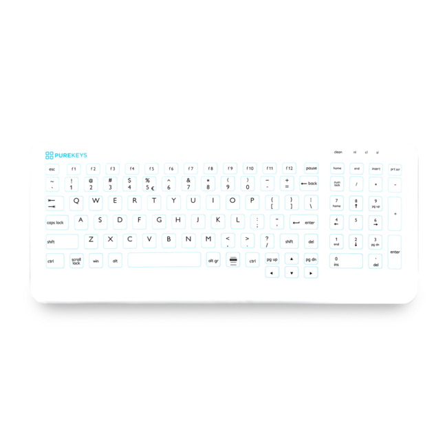 With the Purekeys Compact Medical Keyboard you enjoy a comfortable typing feeling and the optimal hygiene of a completely flat keyboard. The large touchpad is useful in places where the use of a mouse is not possible or not desired. The high-quality silicone top layer is very quick and easy to clean with a cloth. When cleaning, press the special 'cleankey' and the keyboard is switched off so that you do not type anything during cleaning. This keyboard is ideal for hospitals and dentists.