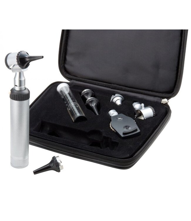 Otoscope head with removable 3x magnifying lens, and insufflator fitting