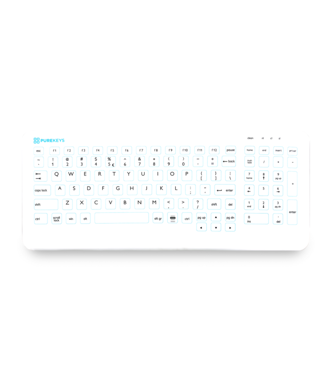 En raison de la surface complètement plane et de l'absence de coutures, le clavier est facile à nettoyer avec une solution désinfectante. Grâce à la fine protection en silicone, les claviers résistent aux liquides de désinfection tandis que l'utilisateur peut taper comme sur un clavier normal. Les claviers médicaux Purekeys résistent à tous les désinfectants connus tels que l'alcool, les peroxydes, les solutions chlorées, etc.