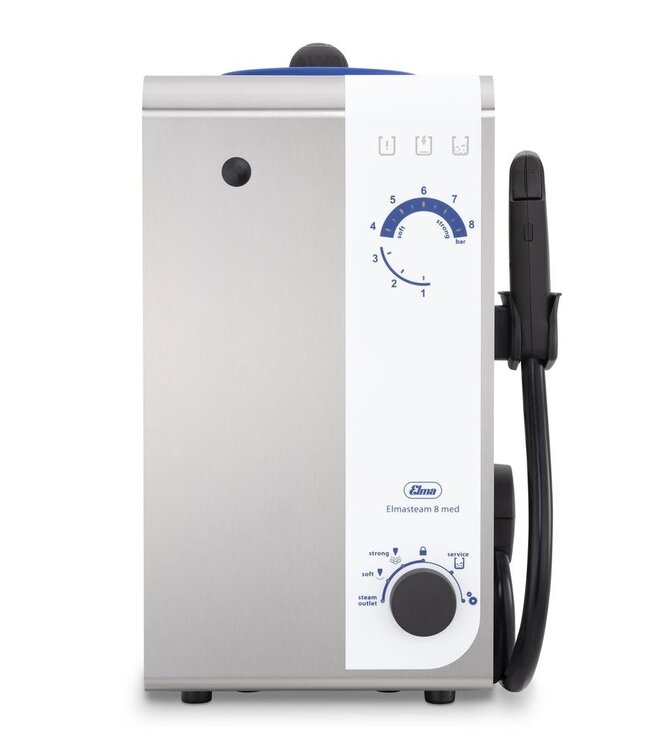 Le système de contrôle intelligent de l'Elmasteam 8 med calcule, au moyen de la dureté de l'eau préréglée et de l'intensité et de la fréquence d'utilisation, le bon moment pour le détartrage. L'utilisateur est guidé pas à pas tout au long du processus de détartrage. Grâce à ce programme de détartrage intégré et à la protection contre la marche à sec du chauffage, l'Elmasteam 8 med est extrêmement fiable et utilisable pendant longtemps.