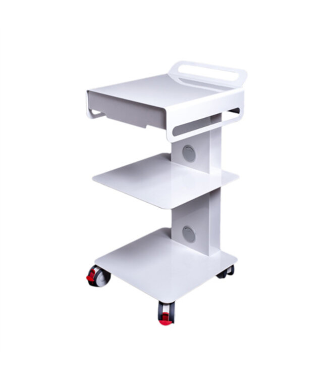 Les 3 poignées-fentes sont conçues pour la manipulation et le positionnement, ainsi que pour le logement de cordons, câbles, pièces à main, etc. Compartiment technique avec serrure de sécurité, équipé de 3 sorties électriques prises. Roues avec roulements à billes et bande de roulement silencieuse.