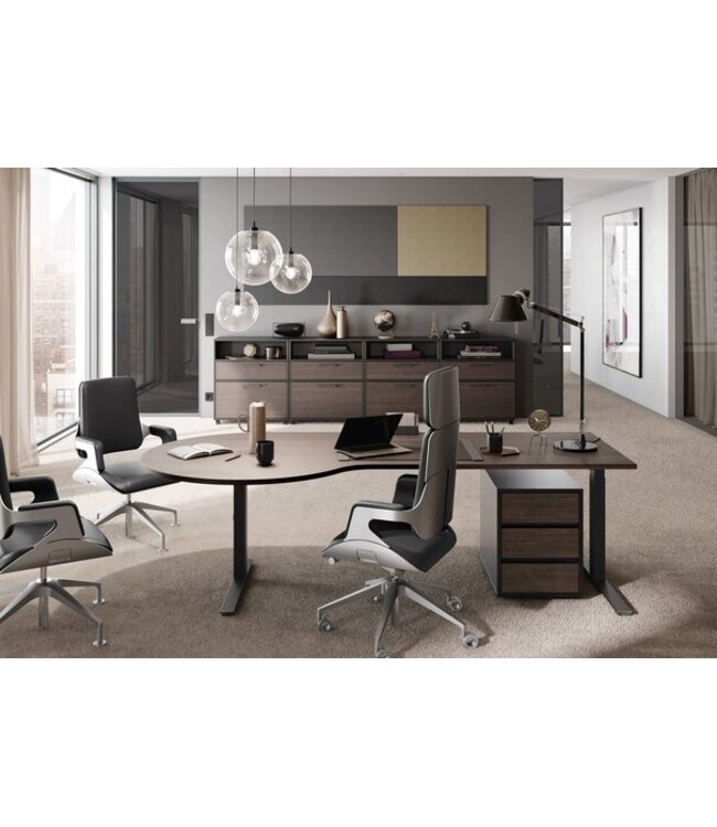 Niet veel ruimte op kantoor? Dan is de com- binatie van onze zit-/statafel CREW in combinatie met de modulekast SELECT de juiste keuze. De visueel aantrekkelijke werkplekoplossing biedt vele voordelen: Meer bewegingsvrijheid door de elektromotorische hoogteverstelling en de aan een zijde ingedokte tafelpoot. Kantoorbenodigdheden, printer of CPU kunnen in het siedboard worden opgeborgen en zijn snel bij de hand.